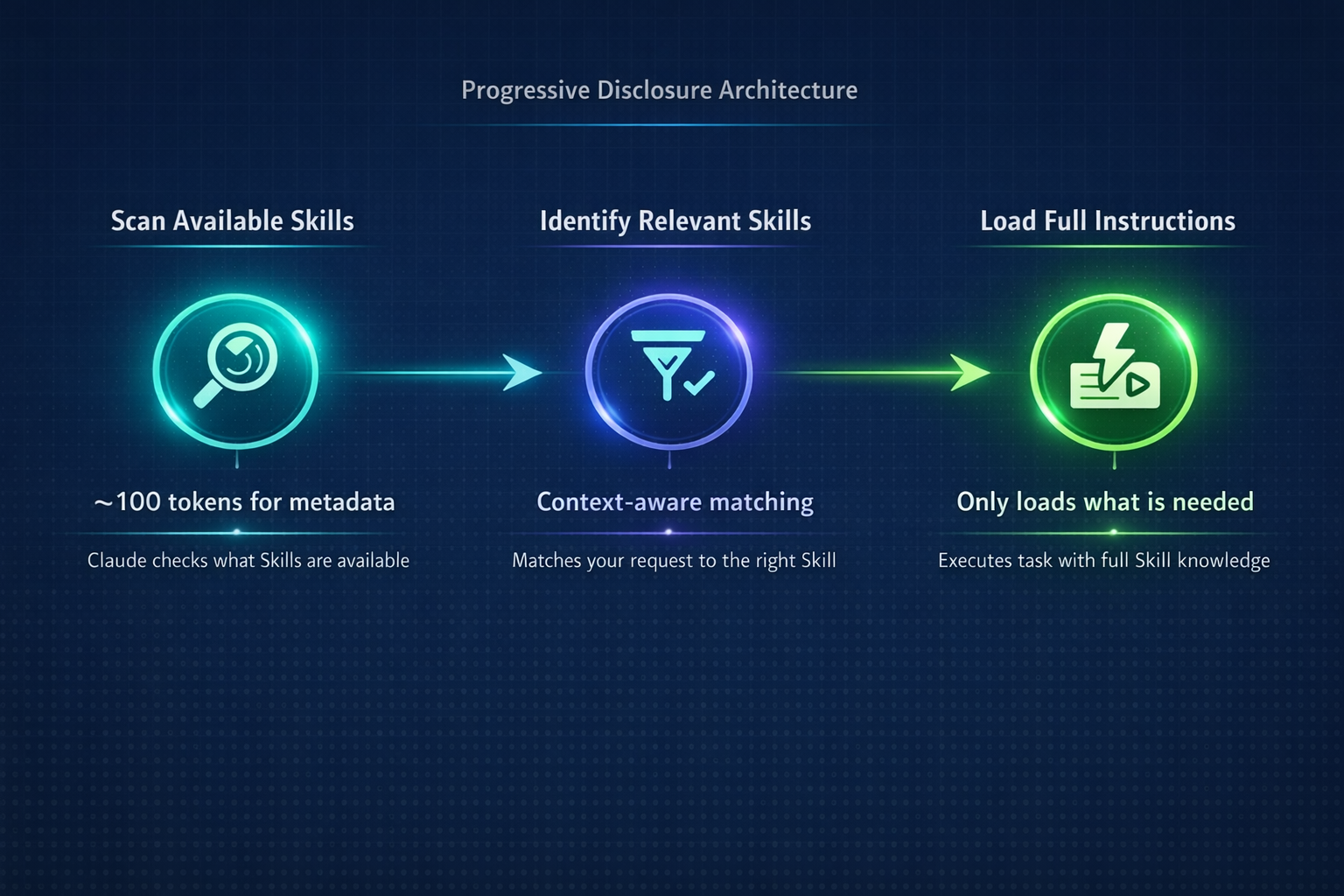 Claude doesn’t load everything at once. It scans available Skills (costing roughly 100 tokens for metadata), identifies which ones are relevant to your task, and only then loads the full instructions. You can have dozens of Skills available without overwhelming the system.
