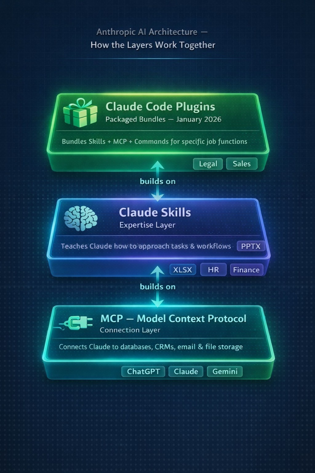 In Anthropic’s evolving architecture, these layers work together. MCP connects Claude to your systems. Skills give Claude the knowledge to work effectively with those systems. And the newest addition – Claude Code Plugins (introduced January 2026) – bundles Skills, MCP connectors, and commands into installable packages for specific job functions like legal review, sales prospecting, and financial reporting.